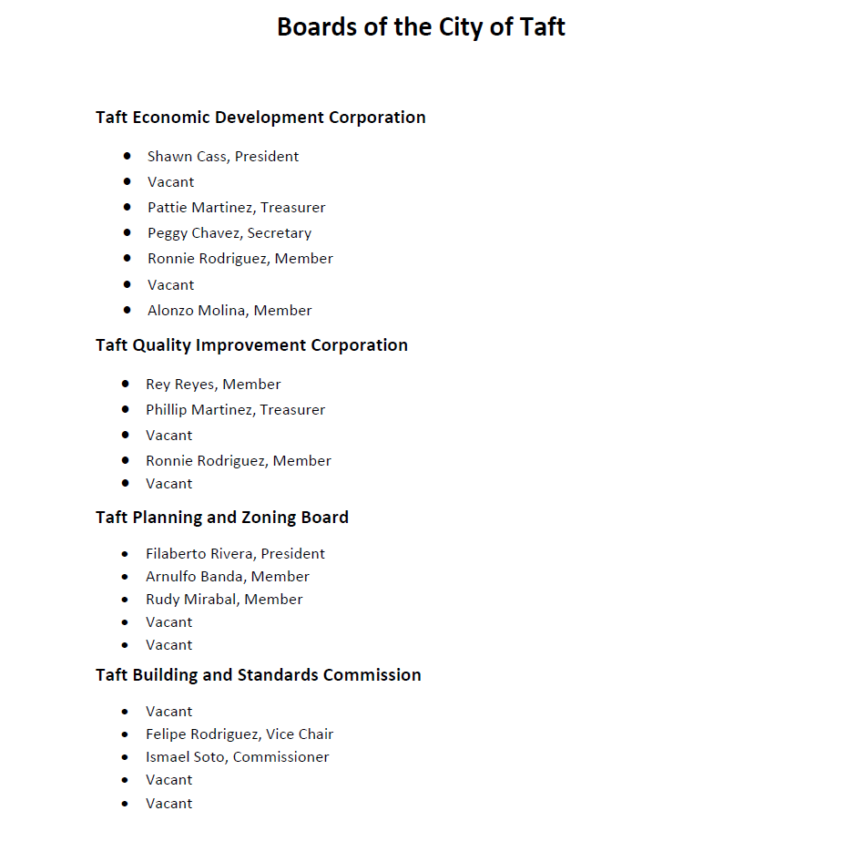 The City of Taft Planning & Zoning Board holds regular meetings on the third Thursday of each month at 6:00 P.M. Unless otherwise noted, meetings take place at City Hall, located at 230 Green Avenue.
